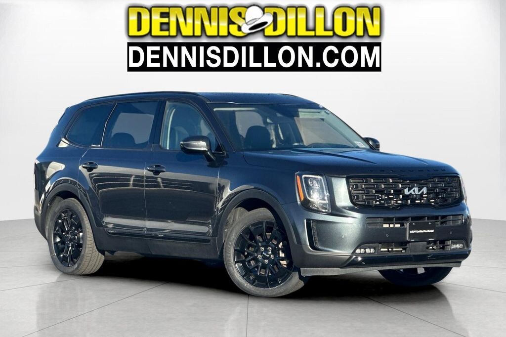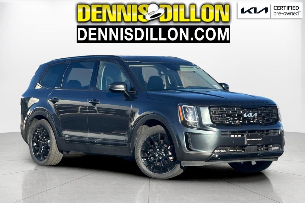 CARFAX One-Owner. Clean CARFAX. Certified. Gravity Gray 2022 Kia Telluride SX AWD 8-Speed Automatic 3.8L V6 DOHC ***KIA CERTIFIED***, **DENNIS DILLON KIA/MAZDA** 208-388-4444 CALL NOW!!!, 10 Speakers, 110V Inverter, 3.648 Axle Ratio, 3rd row seats: split-bench, 4-Wheel Disc Brakes, ABS brakes, Air Conditioning, Alloy wheels, AM/FM radio: SiriusXM, Apple CarPlay & Android Auto, Auto High-beam Headlights, Auto-dimming Rear-View mirror, Automatic temperature control, Black Finish Radiator Grille, Body Color Exterior Door Handles, Brake assist, Bumpers: body-color, Carpeted Floor Mats, Compass, Delay-off headlights, Driver door bin, Driver vanity mirror, Dual front impact airbags, Dual front side impact airbags, Electronic Stability Control, Emergency communication system: 911 Connect, Exclusive Black Fog Light Bezel, Exclusive Black Headlight Bezels, Four wheel independent suspension, Front & Rear Gloss Black Finish Bumper Skid Plates, Front anti-roll bar, Front Bucket Seats, Front Center Armrest, Front dual zone A/C, Front fog lights, Front reading lights, Fully automatic headlights, Garage door transmitter: HomeLink, Gloss Black Finish Exterior Emblems, Gloss Black Finish Front & Rear Door Garnish, Gloss Black Finish Roof Rails, harman/kardon® Speakers, Heads-Up Display, Heated & Ventilated 2nd Row Seats, Heated & Ventilated Front Bucket Seats, Heated door mirrors, Heated front seats, Heated steering wheel, Illuminated entry, Knee airbag, Leather Seat Trim, Leather Shift Knob, Leather steering wheel, Low tire pressure warning, Memory seat, Navigation System, Nightfall Edition Package, Occupant sensing airbag, Outside temperature display, Overhead airbag, Overhead console, Panic alarm, Passenger door bin, Passenger vanity mirror, Power door mirrors, Power driver seat, Power Liftgate, Power moonroof, Power passenger seat, Power steering, Power windows, Premium Cloth Headliner & Pillar Trim, Premium Nappa Leather Seat Trim, Radio data system, Radio: AM/FM harman/kardon Audio System, Rain-Sensing Front Windshield Wipers, Rear air conditioning, Rear anti-roll bar, Rear audio controls, Rear reading lights, Rear window defroster, Rear window wiper, Reclining 3rd row seat, Remote keyless entry, Roof rack: rails only, Security system, Self Leveling Rear Suspension, Smart Key w/ Push Button and Remote Start, Speed control, Speed-sensing steering, Split folding rear seat, Spoiler, Steering wheel mounted audio controls, SX Prestige Package, Tachometer, Telescoping steering wheel, Tilt steering wheel, Tow Hitch w/Harness (TOF), Towing Package, Traction control, Trip computer, Turn signal indicator mirrors, Variably intermittent wipers, Ventilated front seats, Wheels: 20" x 7.5" Black Alloy, Wheels: 20" x 7.5" Exclusive Black Alloy.