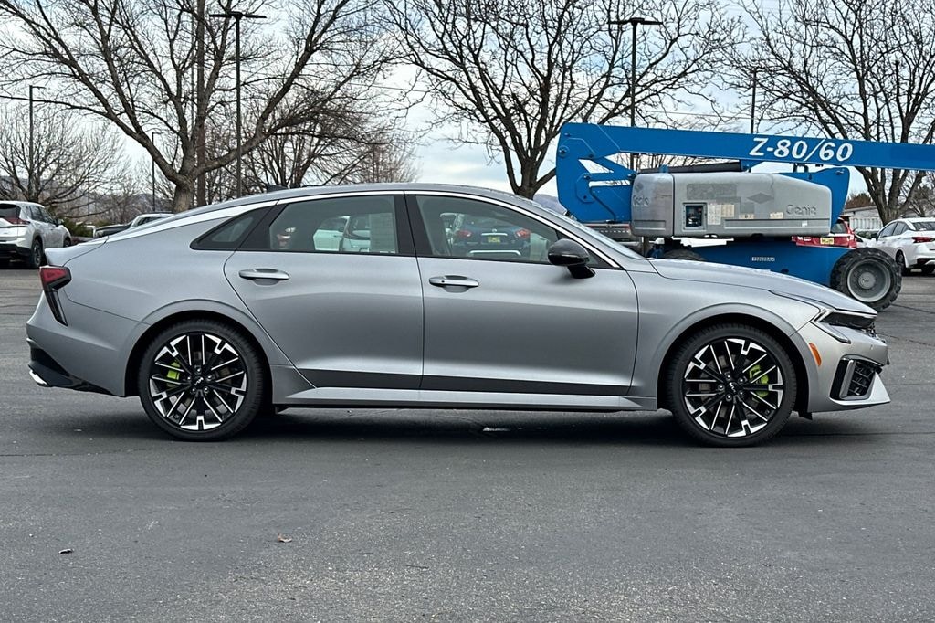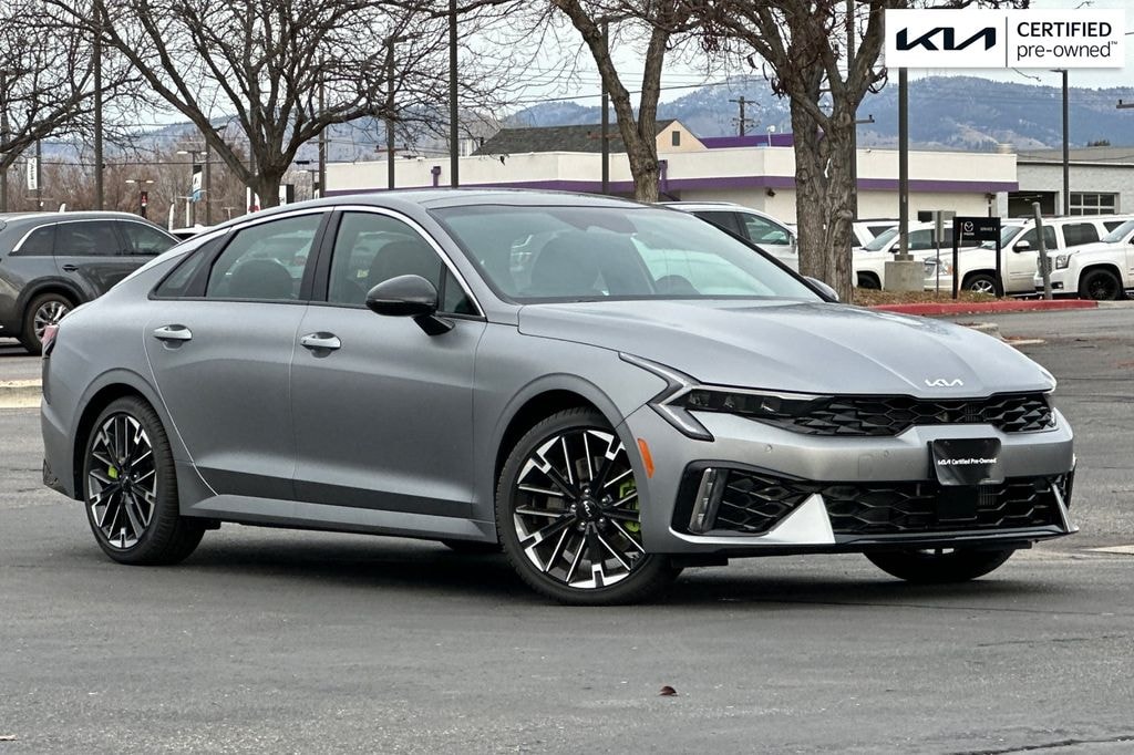 CARFAX One-Owner. Clean CARFAX. Certified. Steel Matte Gray 2026 Kia K5 GT FWD 8-Speed DCT I4 ***KIA CERTIFIED***, **DENNIS DILLON KIA/MAZDA** 208-388-4444 CALL NOW!!!, 4-Wheel Disc Brakes, 6 Speakers, ABS brakes, Air Conditioning, Alloy wheels, AM/FM radio: SiriusXM, Auto High-beam Headlights, Automatic temperature control, Brake assist, Bumpers: body-color, Carpeted Floor Mats, Delay-off headlights, Driver door bin, Driver vanity mirror, Dual front impact airbags, Dual front side impact airbags, Electronic Stability Control, Emergency communication system: Kia Connect (includes 1 year free trial), Four wheel independent suspension, Front anti-roll bar, Front Bucket Seats, Front Center Armrest, Front dual zone A/C, Front fog lights, Front reading lights, Fully automatic headlights, Heated door mirrors, Heated front seats, Heated Sport Bucket Seats, Illuminated entry, Knee airbag, Leather Shift Knob, Leather steering wheel, Low tire pressure warning, Navigation System, Occupant sensing airbag, Outside temperature display, Overhead airbag, Overhead console, Panic alarm, Passenger door bin, Passenger vanity mirror, Power door mirrors, Power driver seat, Power moonroof, Power steering, Power windows, Radio data system, Radio: AM/FM Audio System, Rear anti-roll bar, Rear reading lights, Rear seat center armrest, Rear side impact airbag, Rear window defroster, Remote keyless entry, Security system, Speed control, Speed-sensing steering, Split folding rear seat, Sport steering wheel, Steering wheel mounted audio controls, SynTex Seat Trim, Tachometer, Telescoping steering wheel, Tilt steering wheel, Traction control, Trip computer, Turn signal indicator mirrors, Variably intermittent wipers, Wheels: 19" x 8.0J Gloss Black Machined Finish Alloy.