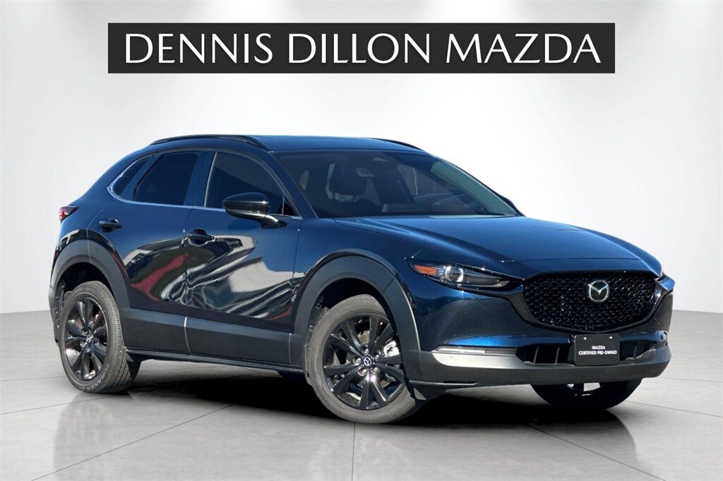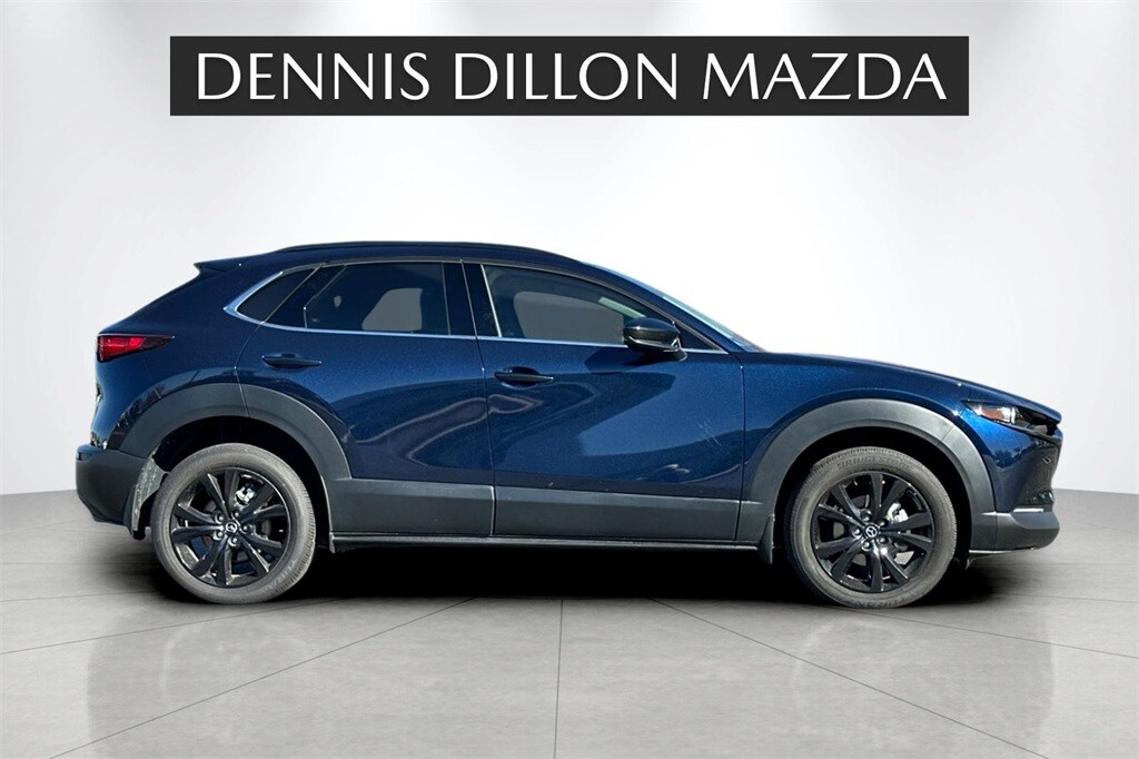 Clean CARFAX. Certified. Deep Crystal Blue Mica 2025 Mazda CX-30 2.5 Turbo Premium Package AWD 6-Speed Automatic 2.5L I4 ///MAZDA CERTIFIED///, 12 Speakers, 4-Wheel Disc Brakes, ABS brakes, Air Conditioning, Alloy wheels, AM/FM radio: SiriusXM, AppLink/Apple CarPlay and Android Auto, Auto High-beam Headlights, Auto-dimming Rear-View mirror, Automatic temperature control, Brake assist, Bumpers: body-color, Compass, Delay-off headlights, Driver door bin, Driver vanity mirror, Dual front impact airbags, Dual front side impact airbags, Electronic Stability Control, Emergency communication system: Mazda Connected Services (3-year trial subscription included), Exterior Parking Camera Rear, Front & Rear Splash Guards, Front anti-roll bar, Front Bucket Seats, Front Center Armrest, Front dual zone A/C, Front reading lights, Front wheel independent suspension, Fully automatic headlights, Heads-Up Display, Heated door mirrors, Heated Front Bucket Seats, Heated front seats, Heated steering wheel, Illuminated entry, Knee airbag, Leather Seat Trim, Leather Shift Knob, Leather steering wheel, Low tire pressure warning, MAZDA CONNECT Infotainment System, Memory seat, Navigation system: MAZDA CONNECT, Occupant sensing airbag, Outside temperature display, Overhead airbag, Overhead console, Panic alarm, Passenger door bin, Passenger vanity mirror, Power door mirrors, Power driver seat, Power Liftgate, Power moonroof, Power steering, Power windows, Radio data system, Radio: AM/FM/HD Audio w/Mazda Online Navigation, Rain sensing wipers, Rear seat center armrest, Rear side impact airbag, Rear window defroster, Rear window wiper, Remote keyless entry, Speed control, Speed-sensing steering, Split folding rear seat, Spoiler, Steering wheel mounted audio controls, Tachometer, Telescoping steering wheel, Tilt steering wheel, Traction control, Trip computer, Turn signal indicator mirrors, Variably intermittent wipers, Wheels: 18" x 7J Aluminum Alloy.