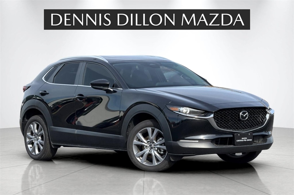 Clean CARFAX. Certified. Jet Black Mica 2025 Mazda CX-30 2.5 S Preferred Package AWD 6-Speed Automatic SKYACTIV® 2.5L 4-Cylinder DOHC 16V ///MAZDA CERTIFIED///, 4-Wheel Disc Brakes, 6 Speakers, ABS brakes, Air Conditioning, Alloy wheels, AM/FM radio, AppLink/Apple CarPlay and Android Auto, Auto High-beam Headlights, Automatic temperature control, Brake assist, Bumpers: body-color, Cargo Tray, Compass, Delay-off headlights, Driver door bin, Driver vanity mirror, Dual front impact airbags, Dual front side impact airbags, Electronic Stability Control, Emergency communication system: Mazda Connected Services (3-year trial subscription included), Exterior Parking Camera Rear, Front anti-roll bar, Front Bucket Seats, Front Center Armrest, Front dual zone A/C, Front reading lights, Front wheel independent suspension, Fully automatic headlights, Heated door mirrors, Heated Front Bucket Seats, Heated front seats, Illuminated entry, Knee airbag, Leather Shift Knob, Leather steering wheel, Leatherette Seat Trim, Low tire pressure warning, MAZDA CONNECT Infotainment System, Memory seat, Occupant sensing airbag, Outside temperature display, Overhead airbag, Overhead console, Panic alarm, Passenger door bin, Passenger vanity mirror, Power door mirrors, Power driver seat, Power moonroof, Power steering, Power windows, Radio data system, Radio: AM/FM Audio System, Rain sensing wipers, Rear seat center armrest, Rear side impact airbag, Rear window defroster, Rear window wiper, Remote keyless entry, Speed control, Speed-sensing steering, Split folding rear seat, Spoiler, Stainless Steel Rear Bumper Guard, Steering wheel mounted audio controls, Tachometer, Telescoping steering wheel, Tilt steering wheel, Traction control, Trip computer, Turn signal indicator mirrors, Variably intermittent wipers, Wheel Locks, Wheels: 18" x 7J Aluminum Alloy.