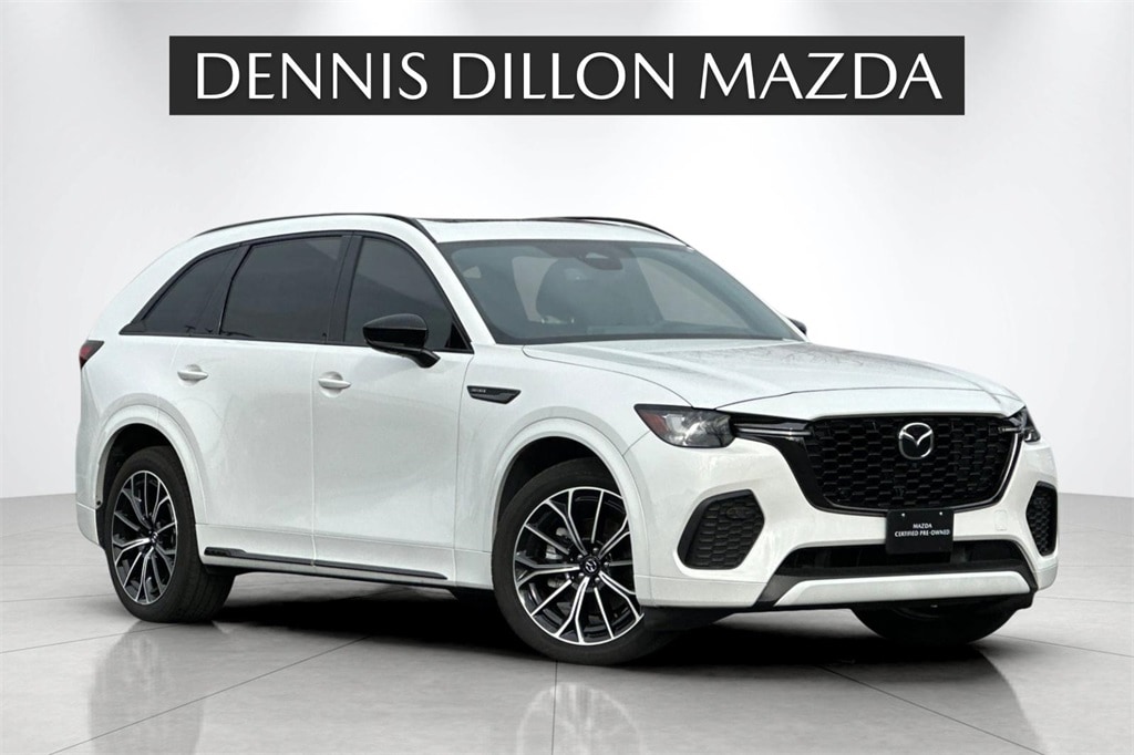 Clean CARFAX. Certified. Rhodium White Premium 2025 Mazda CX-70 3.3 Turbo S Premium AWD 8-Speed Automatic I6 Turbo 12 Speakers, 4-Wheel Disc Brakes, ABS brakes, Air Conditioning, Alloy wheels, AM/FM radio: SiriusXM, Auto High-beam Headlights, Auto-dimming door mirrors, Auto-dimming Rear-View mirror, Automatic temperature control, Brake assist, Bumpers: body-color, Compass, Delay-off headlights, Driver door bin, Driver vanity mirror, Dual front impact airbags, Dual front side impact airbags, E911 Automatic Emergency Notification, Electronic Stability Control, Emergency communication system: MAZDA CONNECT, Four wheel independent suspension, Front anti-roll bar, Front Bucket Seats, Front Center Armrest w/Storage, Front dual zone A/C, Front reading lights, Fully automatic headlights, Garage door transmitter: HomeLink, Heads-Up Display, Heated door mirrors, Heated front seats, Heated rear seats, Heated steering wheel, Heated/Ventilated Front Bucket Seats, Illuminated entry, Infotainment System Voice Command, Knee airbag, Leather Shift Knob, Leather steering wheel, Low tire pressure warning, Mazda Connected Services, Mazda Online Navigation, Memory seat, Nappa Leather Seat Trim, Navigation system: MAZDA CONNECT, Occupant sensing airbag, Outside temperature display, Overhead airbag, Overhead console, Pandora Internet Radio Integration, Panic alarm, Passenger door bin, Passenger vanity mirror, Power door mirrors, Power driver seat, Power Liftgate, Power moonroof, Power passenger seat, Power steering, Power windows, Radio Broadcast Data System Program Information, Radio data system, Radio: AM/FM w/Bose Premium Audio Sound System, Rain sensing wipers, Rear air conditioning, Rear anti-roll bar, Rear reading lights, Rear seat center armrest, Rear window defroster, Rear window wiper, Remote keyless entry, Rhodium White Premium Paint Charge, Security system, SMS Text Msg Audio Delivery & Reply, Speed control, Speed-sensing steering, Split folding rear seat, Spoiler, Steering wheel memory, Steering wheel mounted audio controls, Tachometer, Telescoping steering wheel, Tilt steering wheel, Traction control, Trip computer, Turn signal indicator mirrors, Variably intermittent wipers, Ventilated front seats, Wheels: 21" x 9.5J Aluminum Alloy.