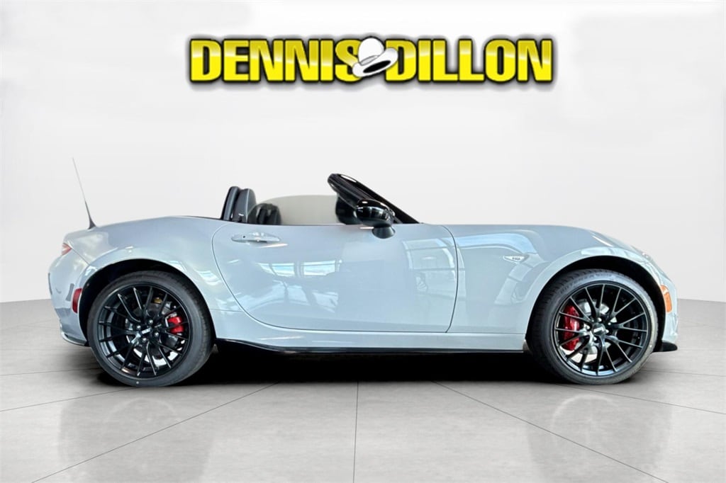 Aero Gray Metallic 2025 Mazda MX-5 Miata Club RWD 6-Speed Manual 2.0L 4-Cylinder DOHC 16V 17 BBS forged dark gunmetal finish alloy wheels, 17 x 7 aluminum alloy wheels with black metallic finish, 4-Wheel Disc Brakes, 9 Speakers, ABS brakes, aero gray metallic paint charge, Air Conditioning, Alloy wheels, AM/FM radio: SiriusXM, AppLink/Apple CarPlay and Android Auto, black rear bumper skirt, bose audio system with audiopilot, Brake assist, Brembo front brakes with red-painted front and rear calipers, Brembo/BBS Recaro package, Bumpers: body-color, cloth upholstery with suede insert, Convertible roof wind blocker, Driver vanity mirror, Dual front impact airbags, Dual front side impact airbags, Electronic Stability Control, Emergency communication system: MAZDA CONNECT, Exterior Parking Camera Rear, Four wheel independent suspension, Front anti-roll bar, Front Bucket Seats, Front Center Armrest, Glass rear window, heated front bucket seats, Heated front seats, heated Recaro sport seats, Illuminated entry, Leather Shift Knob, Low tire pressure warning, MAZDA CONNECT Infotainment system, Nappa leather upholstery with Alcantara insert, Occupant sensing airbag, Outside temperature display, Panic alarm, Passenger vanity mirror, Power door mirrors, Power steering, Power windows, Radio data system, Rear anti-roll bar, Rear window defroster, Remote keyless entry, side sill extensions, Speed control, Speed-sensing steering, Spoiler, Sport steering wheel, Steering wheel mounted audio controls, Tachometer, Telescoping steering wheel, Tilt steering wheel, Traction control, Trip computer, Variably intermittent wipers, weather package.