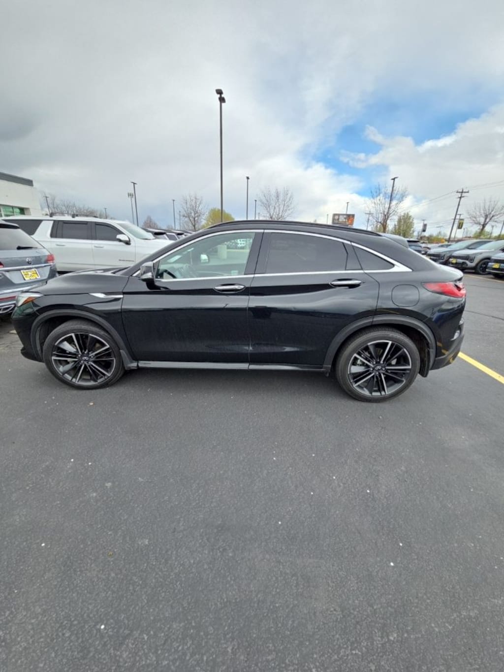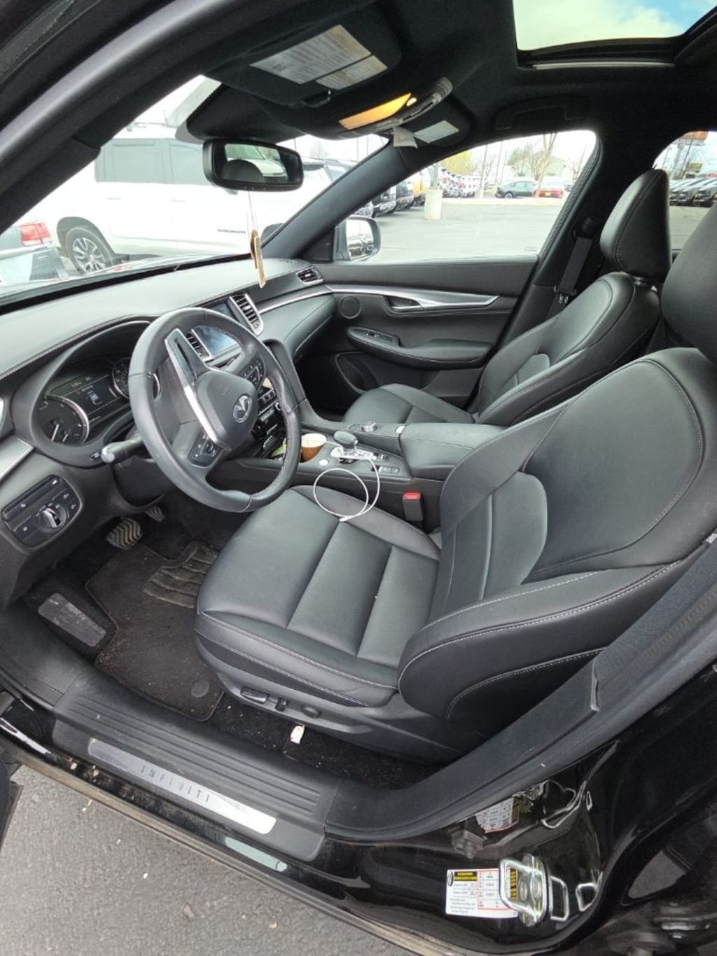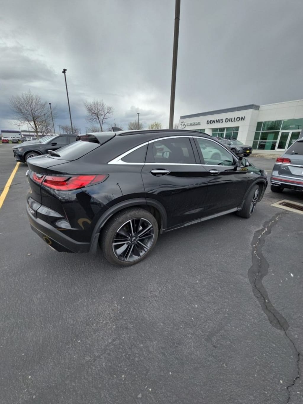 CARFAX One-Owner. Mineral Black 2022 INFINITI QX55 LUXE AWD CVT I4 4-Wheel Disc Brakes, 5.846 Axle Ratio, 6 Speakers, ABS brakes, Air Conditioning, Alloy wheels, AM/FM radio: SiriusXM, AM/FM/CD Audio System, Auto High-beam Headlights, Auto-dimming Rear-View mirror, Automatic temperature control, Black Film Rear Bumper Protector, Black Splash Guards (Set of 4), Blind Spot Warning, Brake assist, Bumpers: body-color, Cargo Net, Cargo Package, Carpeted Floor Mats, CD player, Delay-off headlights, Driver door bin, Driver vanity mirror, Dual front impact airbags, Dual front side impact airbags, Electronic Stability Control, Emergency communication system: INFINITI InTouch, Exterior Parking Camera Rear, Four wheel independent suspension, Front anti-roll bar, Front Bucket Seats, Front Center Armrest, Front dual zone A/C, Front fog lights, Front reading lights, Fully automatic headlights, Garage door transmitter: HomeLink, Heated Front Bucket Seats, Heated front seats, Illuminated entry, Knee airbag, Leather Shift Knob, Leatherette Seat Trim, Low tire pressure warning, Occupant sensing airbag, Outside temperature display, Overhead airbag, Overhead console, Panic alarm, Passenger door bin, Passenger vanity mirror, Power door mirrors, Power driver seat, Power Liftgate, Power moonroof, Power passenger seat, Power steering, Power windows, Premium Paint, Radio data system, Rear anti-roll bar, Rear Parking Sensors, Rear reading lights, Rear seat center armrest, Rear window defroster, Rear window wiper, Remote keyless entry, Reversible Cargo Mat, Security system, Speed control, Speed-sensing steering, Speed-Sensitive Wipers, Split folding rear seat, Spoiler, Steering wheel mounted audio controls, Tachometer, Telescoping steering wheel, Tilt steering wheel, Traction control, Trip computer, Turn signal indicator mirrors, Variably intermittent wipers, Wheels: 20" x 8.5" Machine Finish Aluminum Alloy.