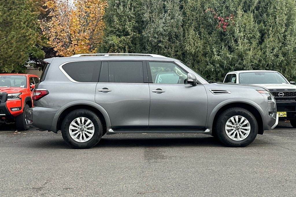 CARFAX One-Owner. Gun Metallic 2024 Nissan Armada SV 4WD 7-Speed Automatic 5.6L V8 DOHC 32V LEV3-ULEV125 400hp 18" x 8J Alloy Wheels, 2.937 Axle Ratio, 3rd Row Carpeted Floor Mats - Bench Seat, 3rd row seats: split-bench, 4-Wheel Disc Brakes, 6 Speakers, ABS brakes, Air Conditioning, Alloy wheels, AM/FM radio: SiriusXM, Anti-whiplash front head restraints, Auto High-beam Headlights, Auto tilt-away steering wheel, Auto-dimming Rear-View mirror, Auto-leveling suspension, Automatic temperature control, Brake assist, Bumpers: body-color, Cargo Package, Delay-off headlights, Driver door bin, Driver vanity mirror, Dual front impact airbags, Dual front side impact airbags, Electronic Stability Control, Emergency communication system: NissanConnect Services, Exterior Parking Camera Rear, Four wheel independent suspension, Front anti-roll bar, Front Bucket Seats, Front Center Armrest, Front dual zone A/C, Front fog lights, Front reading lights, Fully automatic headlights, Garage door transmitter: HomeLink, Heated door mirrors, Heated Front Bucket Seats, Heated front seats, Illuminated entry, Knee airbag, Leather Shift Knob, Leather steering wheel, Leatherette Seat Trim, Low tire pressure warning, Navigation System, Occupant sensing airbag, Outside temperature display, Overhead airbag, Overhead console, Panic alarm, Passenger door bin, Passenger vanity mirror, Power door mirrors, Power driver seat, Power passenger seat, Power steering, Power windows, Radio: NissanConnect w/SiriusXM, Rear air conditioning, Rear anti-roll bar, Rear reading lights, Rear seat center armrest, Rear window defroster, Rear window wiper, Reclining 3rd row seat, Remote keyless entry, Security system, Speed control, Speed-sensing steering, Speed-Sensitive Wipers, Split folding rear seat, Spoiler, Steering wheel mounted audio controls, Tachometer, Telescoping steering wheel, Tilt steering wheel, Traction control, Trip computer, Turn signal indicator mirrors, Variably intermittent wipers, Voltmeter.